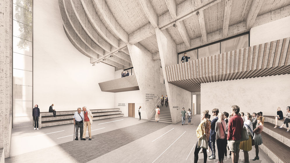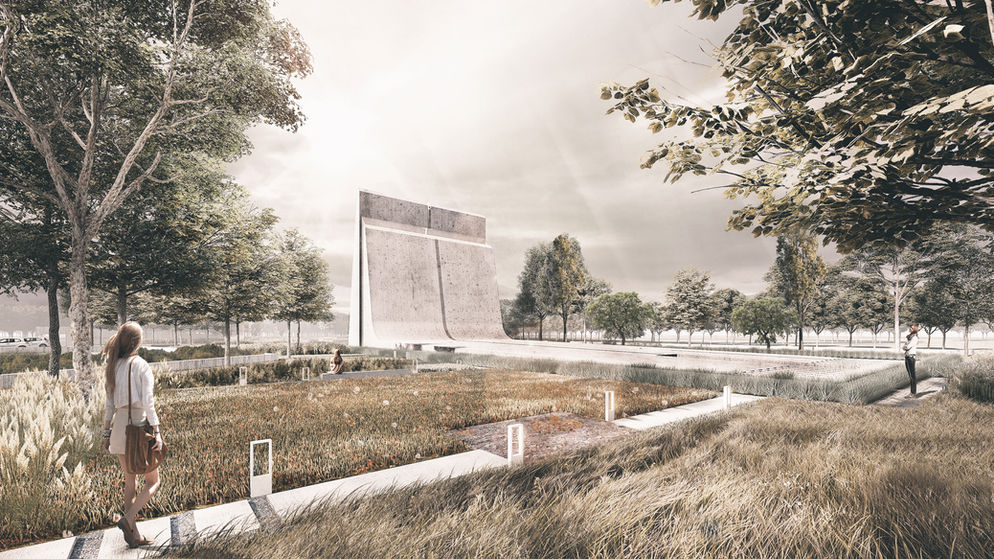 Ceremonial ground; The reflection pool, the monument, is located in a plane surrounded by the memorial wall. Besides, the ceremonial area is defined as the fringing area of the foyer area. The route continues both from inside the structure and from the lateral axes. The route continues through the structure and from the side axles. Stairs are designed beyond the observation walls defined by the names of the martyrs. These stairs primarily follow the courtyard of the library and temporary exhibition spaces. This system then accentuates the axis reaching the river. Along with the emphasis of this axis, the secondary axles that emphasize singularity are also designed as auxiliary landscape lines. The lateral axes perpendicular to the main axle, infiltrating into the existing trees and landscape texture, serve as a call to the spaces where the route and the exhibition space, which are located outside the route, can be experienced alone.